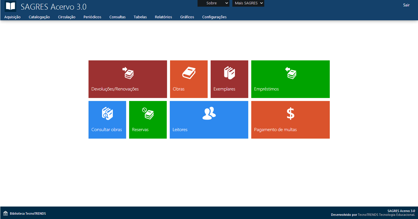 Após informar seus dados e clicar em “Entrar”, o usuário será redirecionado para a área de trabalho padrão do sistema (ambiente do bibliotecário), caso a autenticação tenha sido bem-sucedida. A tela exibirá todas as funções as quais o usuário possui direito de acesso: