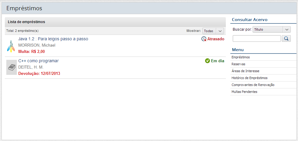 Nesta interface, são exibidos os Títulos, os nomes dos Autores e as Situações dos diversos empréstimos (Atrasado e o valor da Multa; ou Em dia e a Data da Devolução).