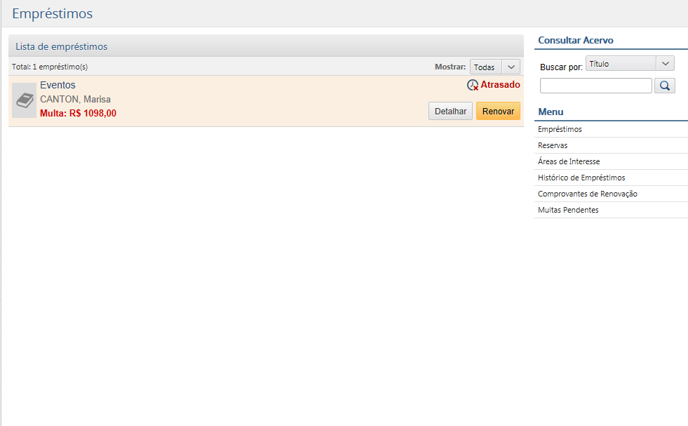 Ao passar o cursor do mouse sobre cada obra, o usuário visualizará dois botões: Detalhar (exibe detalhes da obra) e Renovar (permite renovar o empréstimo da obra), como mostra a figura abaixo. A função Detalhar também pode ser acessada quando clicamos sobre o Título da obra.
