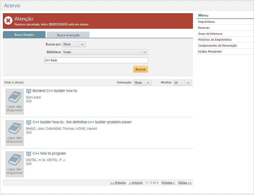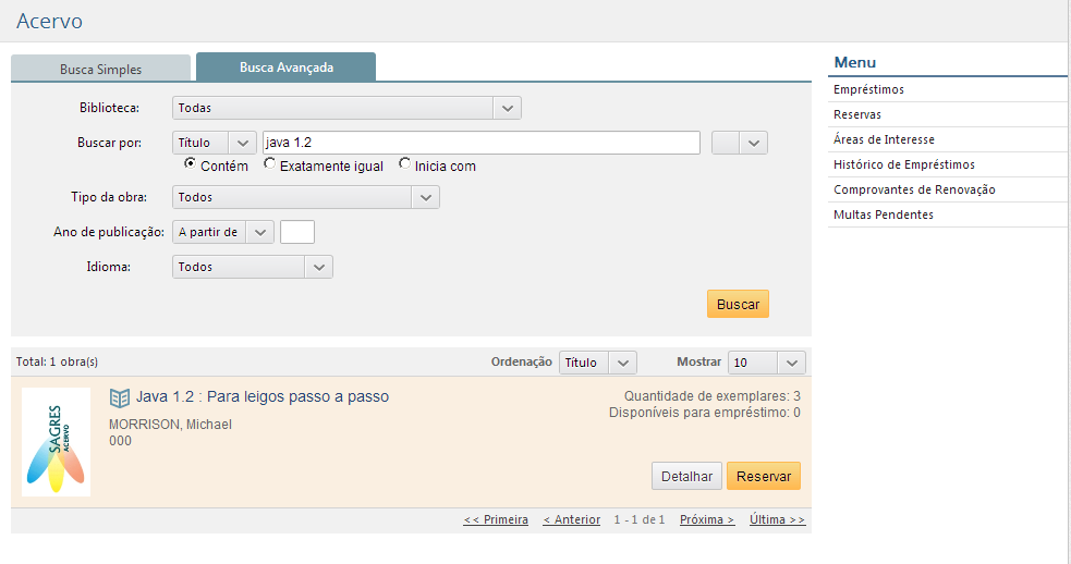 Acessível através da interface inicial do Ambiente do Leitor, através das pastas Busca Simples e Busca Avançada, quando passamos o cursor do mouse sobre os dados da obra que se deseja reservar. A função Reservar permite ao leitor solicitar a reserva da obra selecionada.