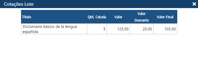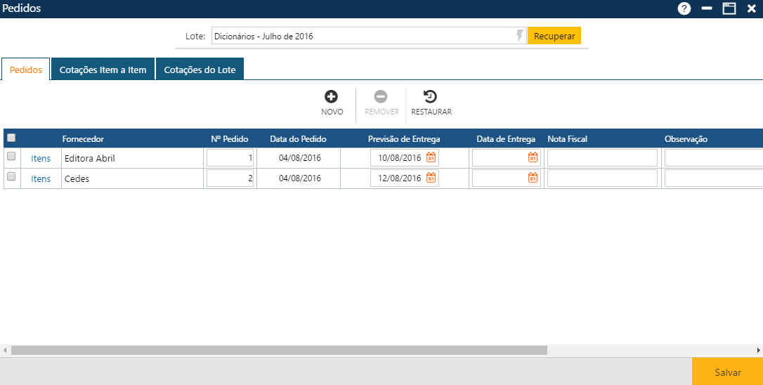 Interface que faz parte da rotina de Aquisição e serve para cadastrar os pedidos das obras. Os pedidos podem envolver diferentes fornecedores. Na interface também são apresentadas as cotações realizadas anteriormente. Portanto, o cadastramento prévio das cotações é pré-requisito para o cadastramento dos pedidos. As cotações são realizadas para lotes de obras, com um ou mais títulos. Para cada título, são registradas as cotações em diversos fornecedores.