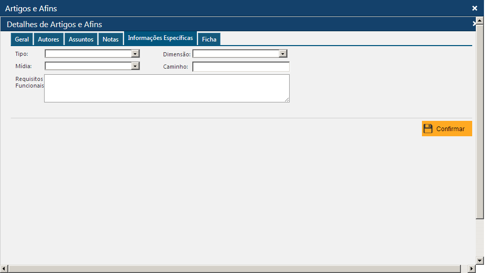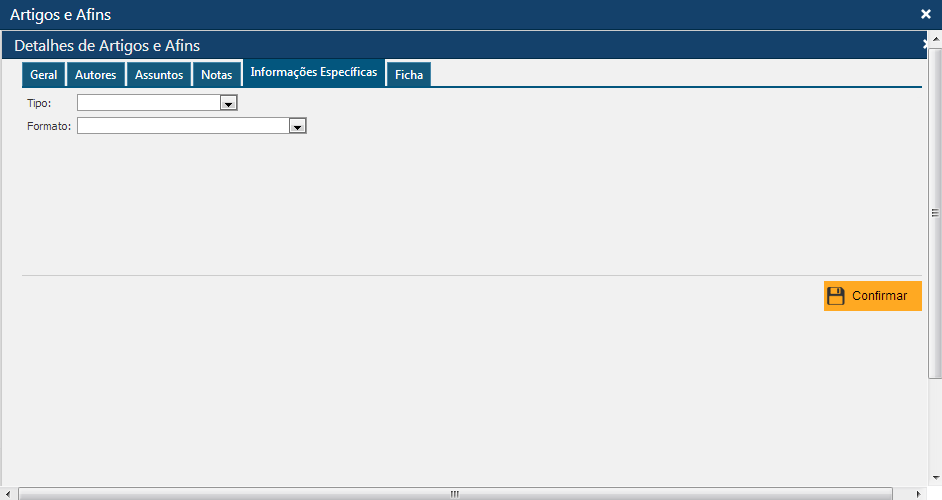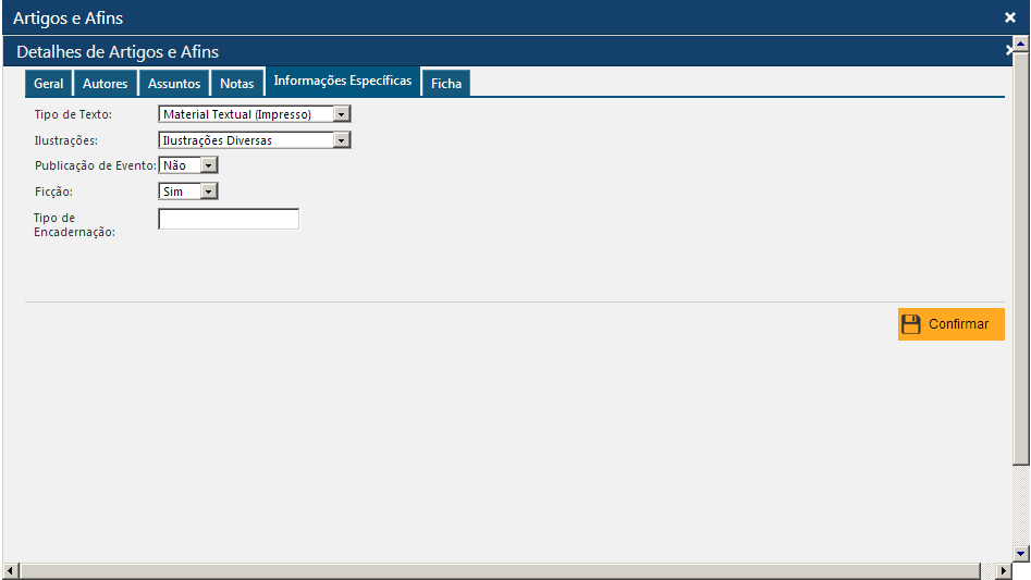 Esta pasta só fica habilitada após a escolha do tipo de obra. As informações específicas são regulamentadas pelo padrão MARC.