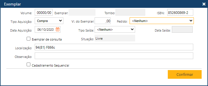Caso se trate de um exemplar adquirido em um processo controlado pelo sistema, ou seja, cadastrado no sistema, é possível associar este exemplar ao seu pedido realizando a integração dessa rotina com a rotina de Aquisição.