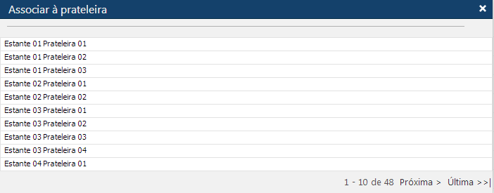 Após os exemplares serem visualizados na grade, é possível selecioná-los (marcando na primeira coluna das linhas dos exemplares desejados) e associá-los a uma prateleira através da interface apresentada ao acionarmos o botão “Associar”. Esta nova interface apresenta uma lista com todas as prateleiras da biblioteca, com suas estantes. O usuário deve selecionar com um duplo click a estante desejada, que será associada às obras selecionadas. No final, deverá acionar o botão Salvar.