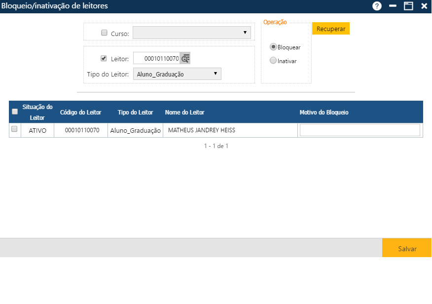 Para bloquear/inativar um único leitor, o usuário deverá selecionar a opção Bloquear ou Inativar, marcar a opção Leitor e informar o código do Leitor (o usuário pode utilizar a função Pesquisar, disponível no final do campo Leitor). Por fim, deve acionar o botão Recuperar. O sistema apresentará o Leitor solicitado. Após marcar o Leitor, o usuário deverá acionar o botão Salvar. Caso não ocorram erros, o sistema exibirá a mensagem “O registro foi atualizado com sucesso”.