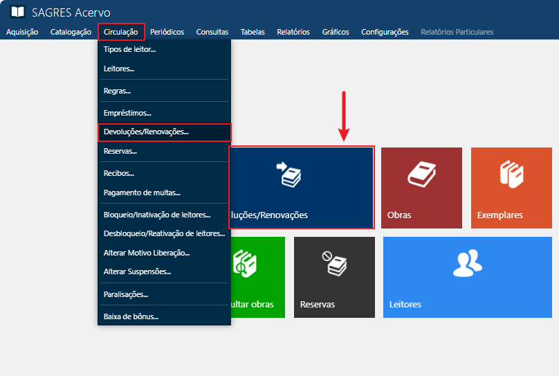 Essa funcionalidade é acessível através do menu Circulação > Devoluções/Renovações.