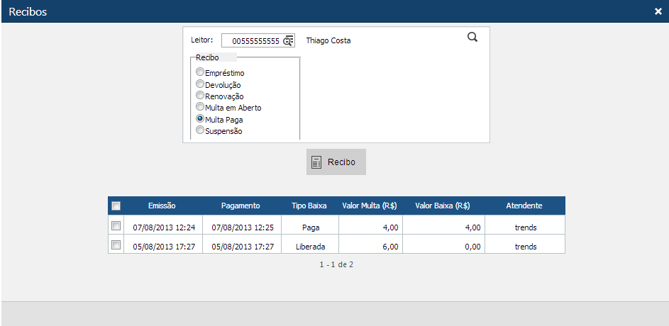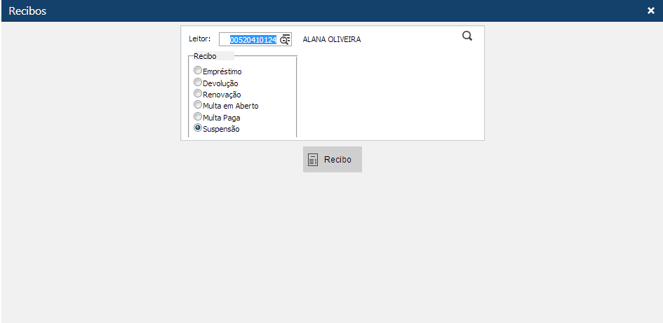 Para emitir os recibos de empréstimo, devolução, renovação ou multa paga, a opção deve ser escolhida, o leitor deve ser informado, seus dados recuperados e os registros a serem impressos têm que ser selecionados na grade que lista os exemplares. Em seguida,  o botão “Recibo” deve ser acionado. Caso deseje, a emissão de um recibo de multa em aberto ou suspensão, basta informar a opção desejada, o leitor e, em seguida, acionar o botão “Recibo”.