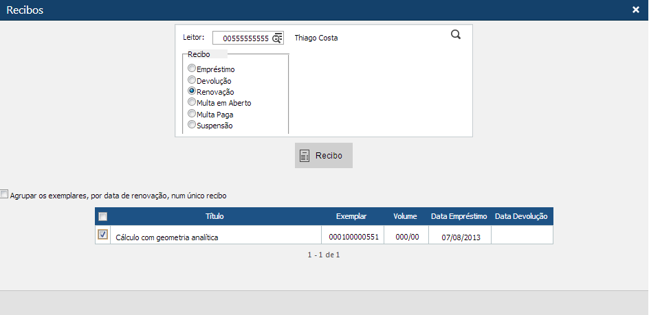 Na interface, o usuário pode solicitar que os exemplares apareçam agrupados por data de empréstimo num único recibo.