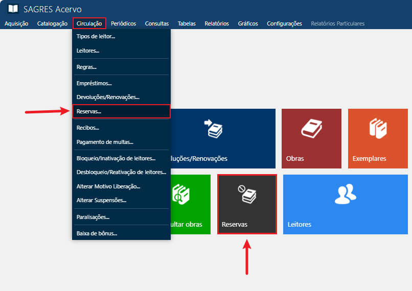 Acessível pelo menu Circulação > Reservas ou através do ícone Reservas.