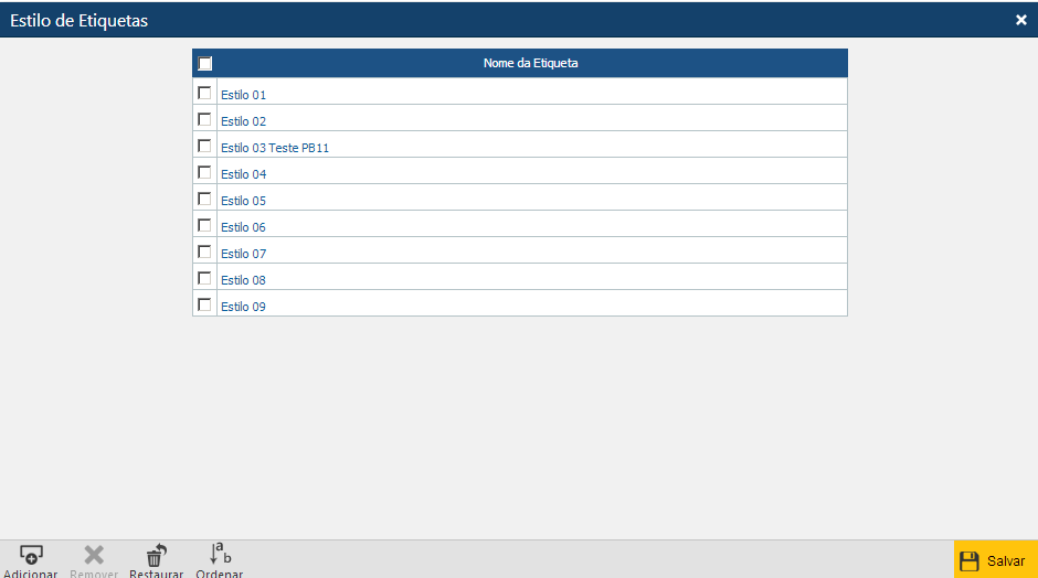 Nesta interface, podemos definir estilos para etiquetas. Esses estilos posteriormente poderão ser associados às várias etiquetas utilizadas para diversas situações no sistema (interface Estilo x Configuração (Etiqueta)).