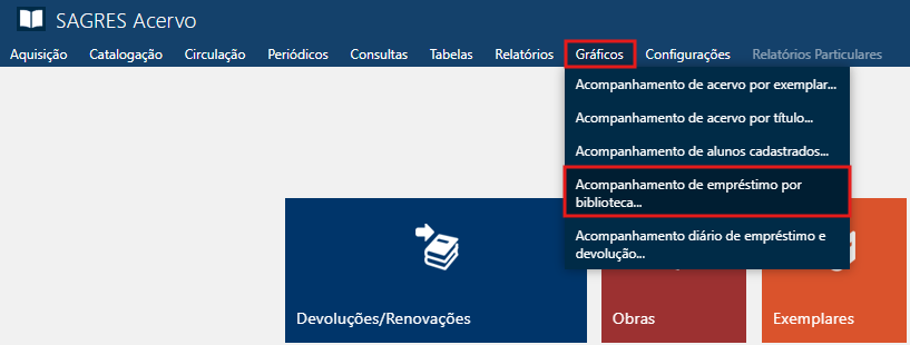 Acessível pelo menu Gráficos > Acompanhamento de Empréstimo por Biblioteca.