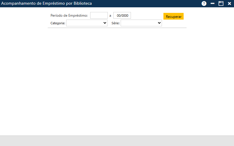 Inicialmente, o usuário deve escolher qual o Período de Empréstimo, a Categoria (Biblioteca ou Período de Empréstimo) e a Série (Biblioteca ou Período de Empréstimo) que deverão ser considerados.