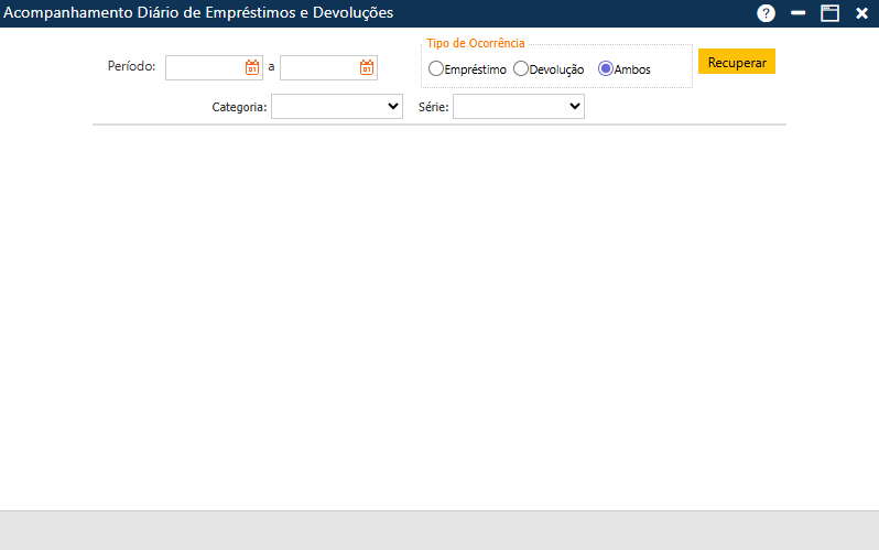 Inicialmente, o usuário deve escolher qual o Período, o Tipo de Ocorrência (Empréstimo, Devolução ou Ambos), a Categoria (Biblioteca, Período ou Tipo de Ocorrência) e a Série (Biblioteca, Período ou Tipo de Ocorrência) que deverão ser considerados.
