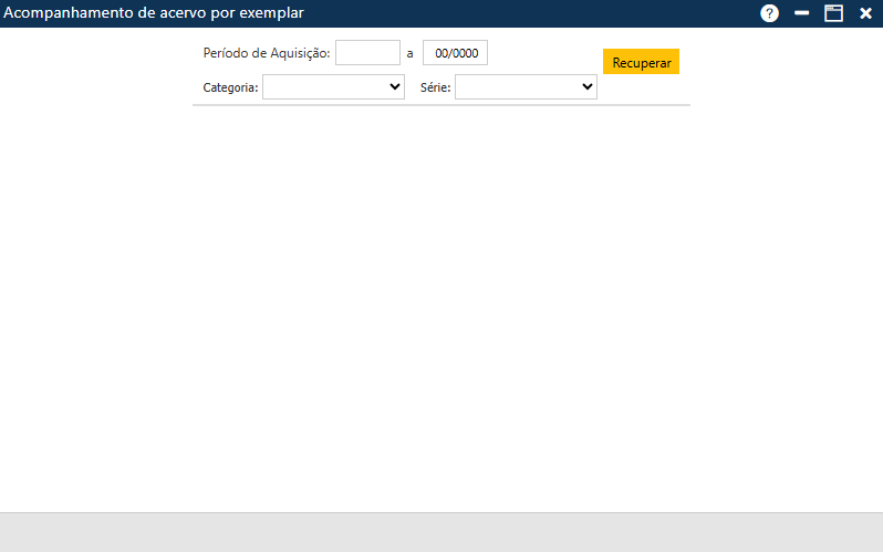 Inicialmente, o usuário deve escolher qual o Período de Aquisição, a Categoria (Biblioteca ou Período de Aquisição) e a Série (Biblioteca ou Período de Aquisição) que deverão ser considerados.