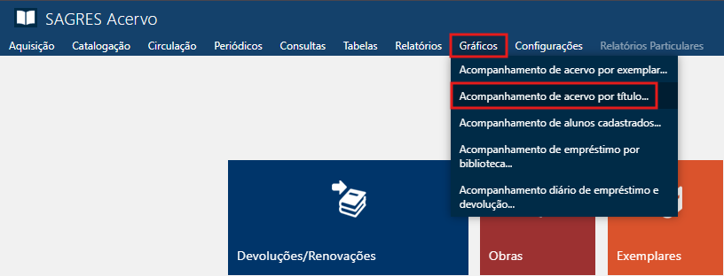 Acessível pelo menu Gráficos > Acompanhamento do Acervo por Título.