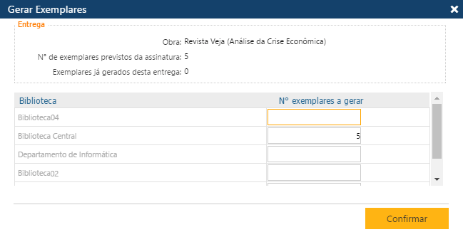 As entregas que tiverem exemplares gerados não poderão ter nem as datas nem os fascículos alterados. O sistema emite a mensagem “Não é possível alterar a entrega pois existem exemplares cadastrados”.
