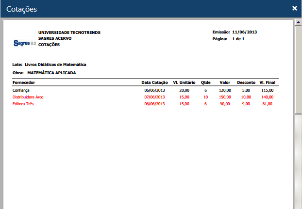 As Cotações listadas em vermelho são as com menores valores unitários.