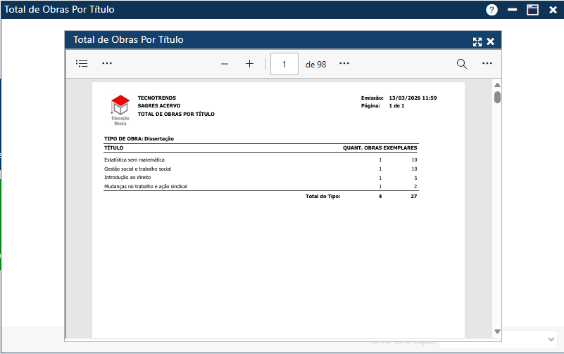 Acessível pelo menu Relatório > Catalogação > Total de Obras por Título.