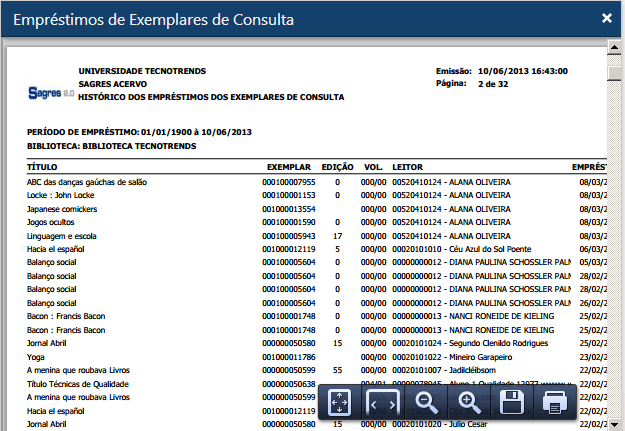 Interface do relatório de Empréstimos de Exemplares de Consulta
