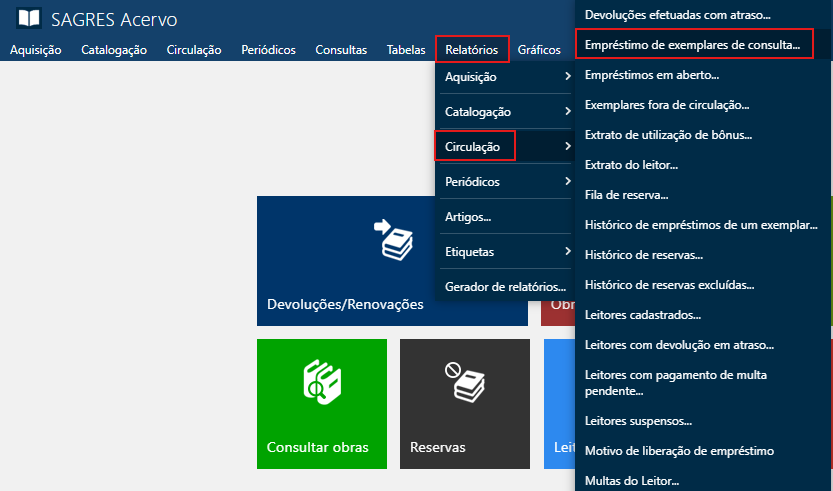 Acessível pelo menu Relatórios > Circulação > Empréstimos de Exemplares de Consulta.