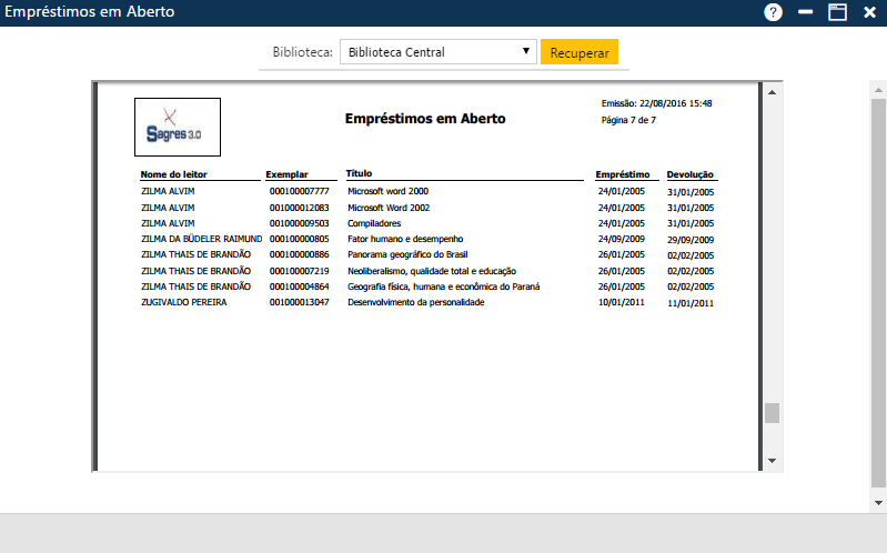 Relatório que fornece uma lista com as obras que estão emprestadas aos Leitores, isto é, são exemplares que não estão livres, sejam de empréstimos com ou sem atrasos nas devoluções, e serve para o bibliotecário controlar melhor as obras que estão em circulação.
