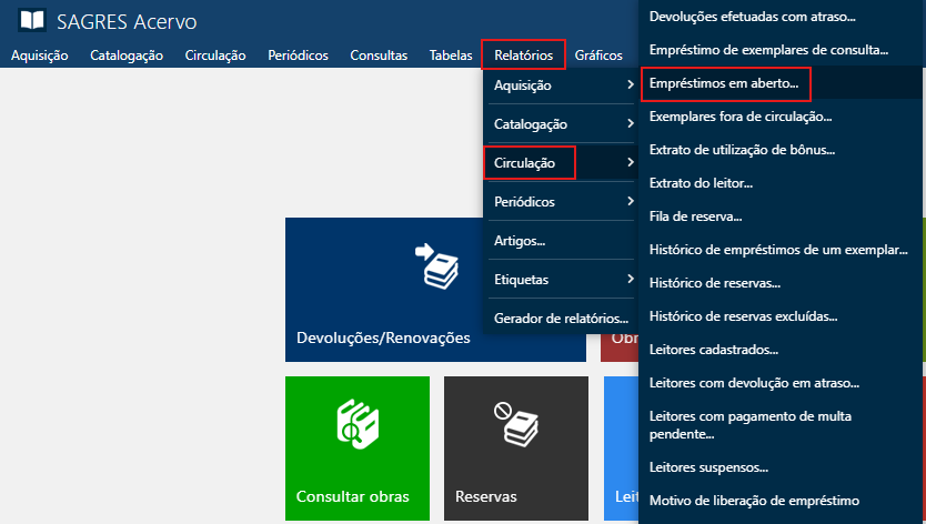 Menu de Acesso - Relatórios > Circulação > Empréstimos em aberto