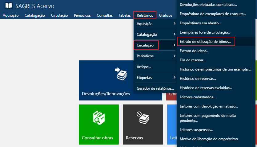 Acessível pelo menu Relatórios > Circulação > Extrato de Utilização de Bônus.