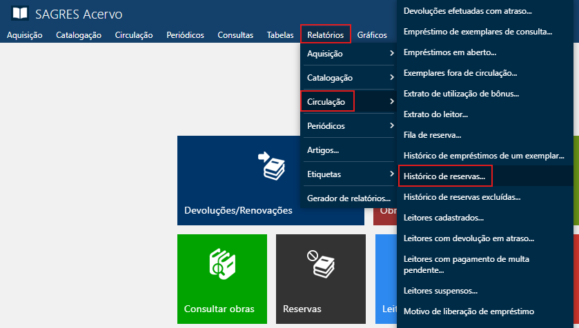 Acessível pelo menu Relatórios > Circulação > Histórico das Reservas.