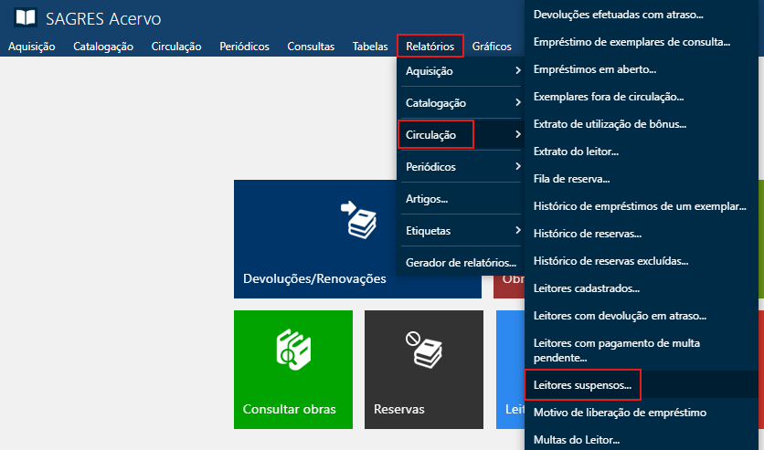 O usuário pode filtrar o relatório de leitores suspensos para que sejam retornados apenas os leitores ativos na instituição, selecionando a caixa de texto “Exibir somente leitores ativos”.