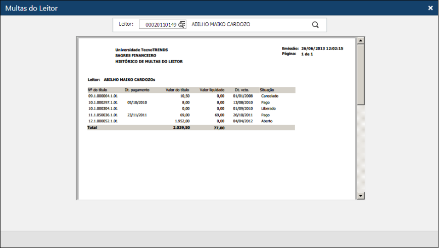 Relatório que fornece o histórico das multas do leitor.