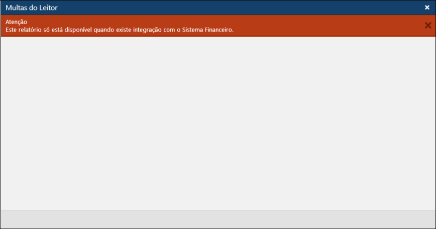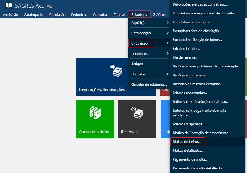 Acessível pelo menu Relatórios > Circulação > Multas do Leitor.