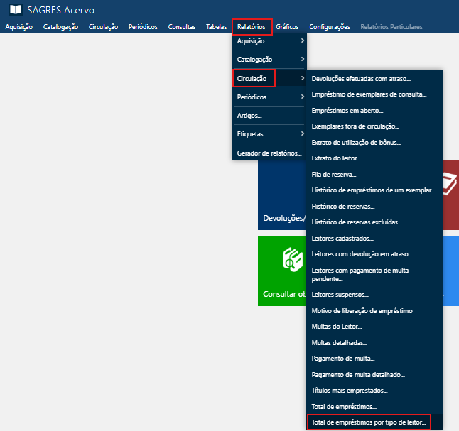 Acessível pelo menu Relatórios > Circulação > Total de Empréstimos por Tipo de Leitor.