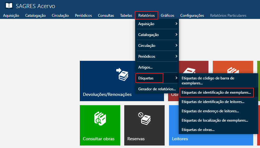 Acessível pelo menu Relatórios > Etiquetas > Etiquetas de Identificação de Exemplares.