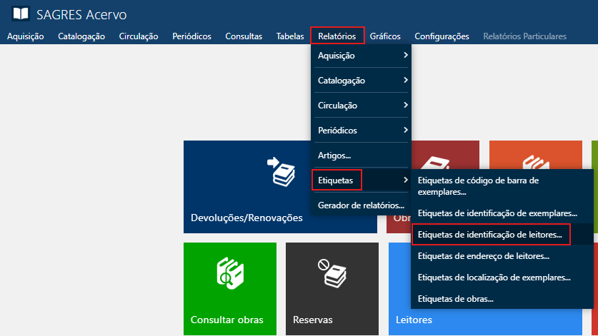 Acessível pelo menu Relatórios > Etiquetas > Etiquetas de identificação de leitores.