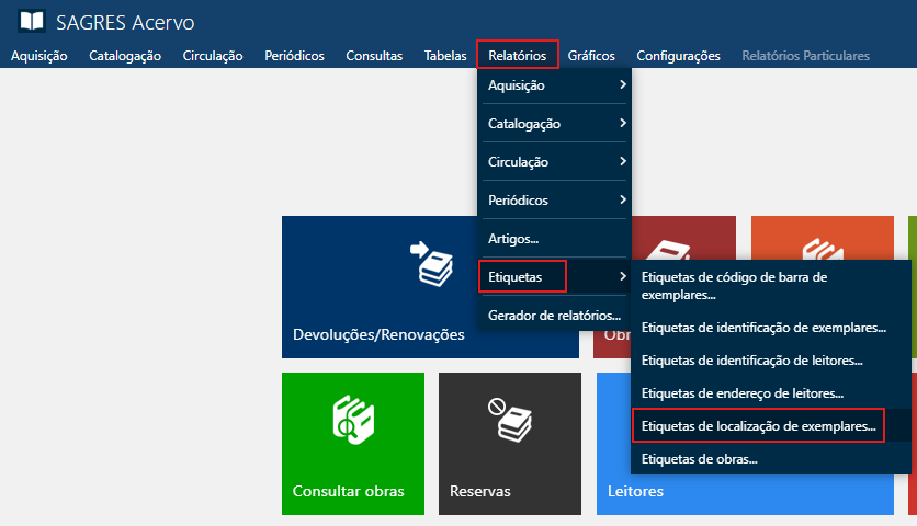 Acessível pelo menu Relatórios > Etiquetas > Etiquetas de localização de exemplares.