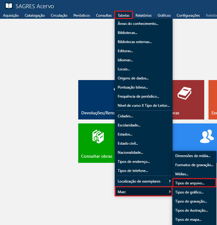 Acessível pelo menu Tabelas > MARC > Tipos de Arquivo.