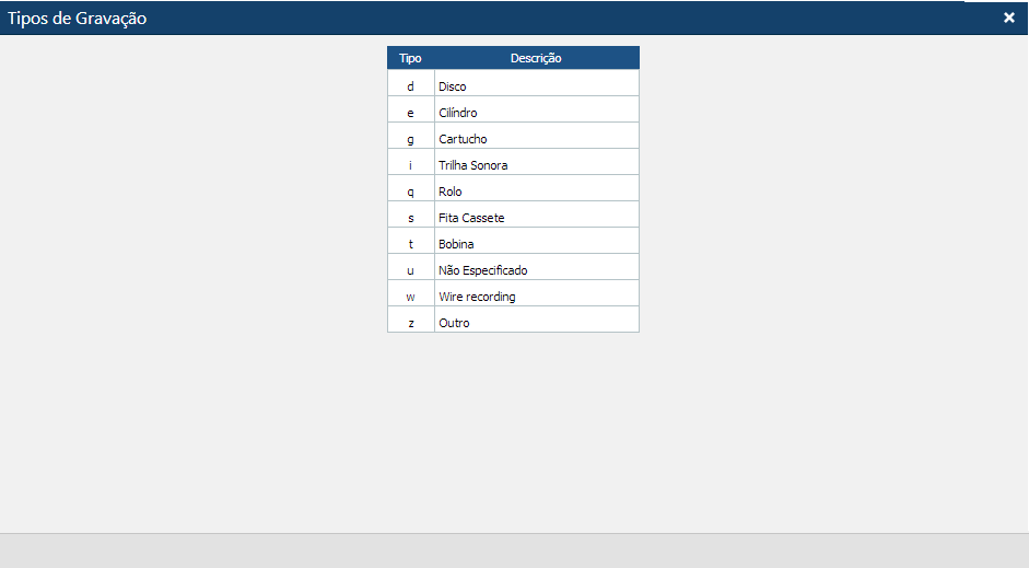 Tabela que contém os tipos de gravações sonoras. Faz parte de um conjunto de tabelas básicas para a implantação da estrutura de dados do aplicativo SAGRES Acervo, que é carregado durante o processo de instalação do sistema. O usuário não atualiza estas tabelas. Os dados destas tabelas são regulamentados pelo padrão MARC.