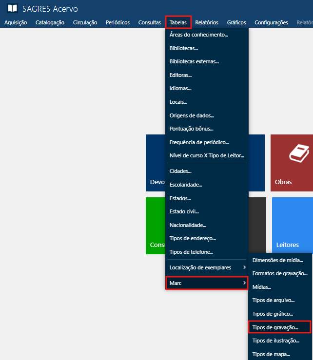 Acessível pelo menu Tabelas > MARC > Tipos de Gravação.