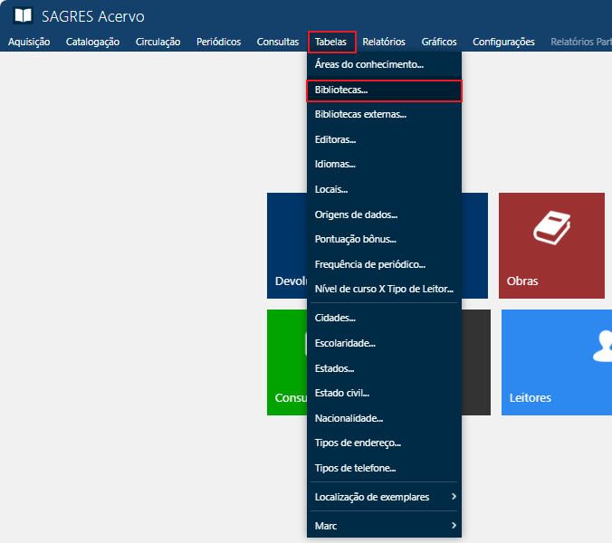 Acessível pelo menu Tabelas > Bibliotecas.​