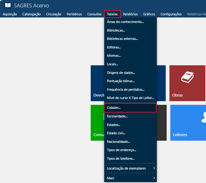 Acessível pelo menu Tabelas > Cidades.