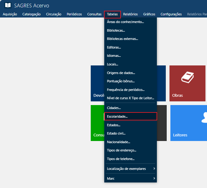 Acessível pelo menu Tabelas > Escolaridade.