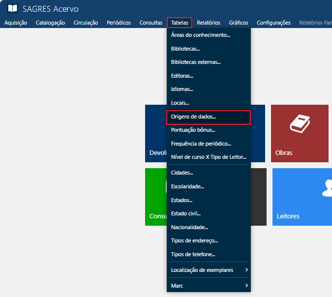 Acessível pelo menu Tabelas > Origens de dados.