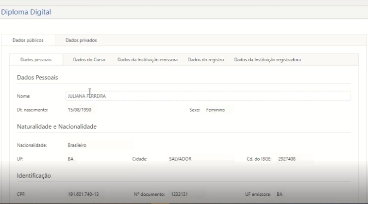Uma representação visual do Diploma está disponível, para visualização, é preciso que o usuário clique em representação visual, e o sistema apresentará uma nova interface (veja figura abaixo).