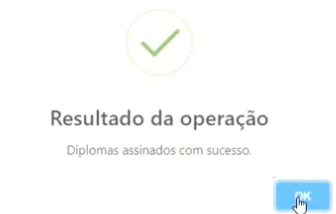 Após assinatura o sistema emitirá a mensagem do resultado da operação. Lembrando que, apenas após a última assinatura do representante da IES Registradora o diploma estará automaticamente disponível para o aluno e a comunidade externa para consulta.