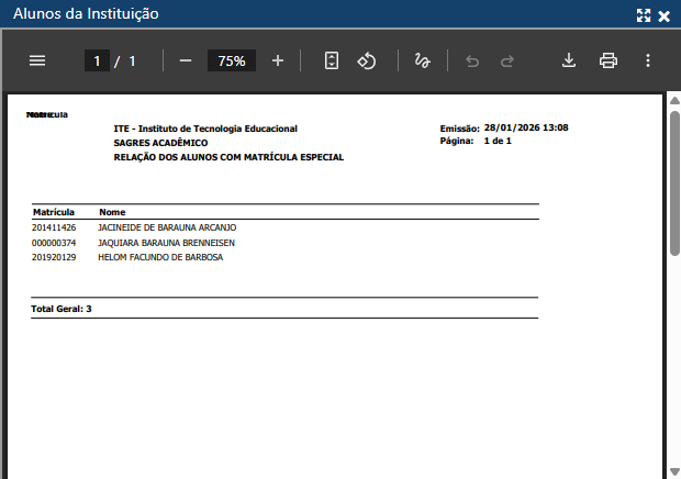 O sistema exibirá o relatório de Alunos Especiais com as informações selecionadas, como ilustrado no exemplo acima.