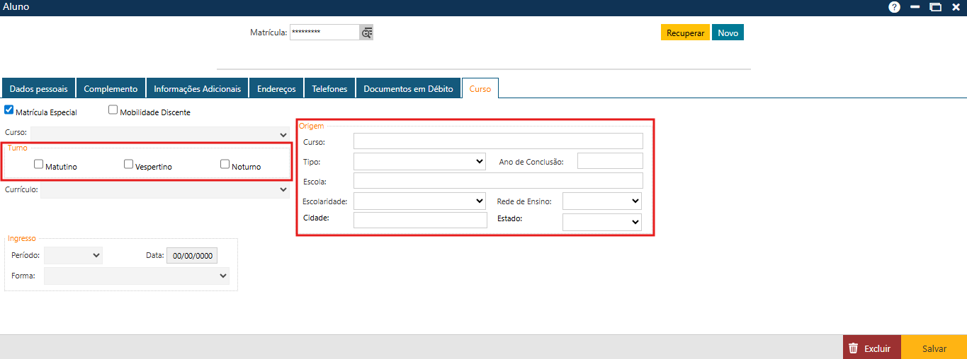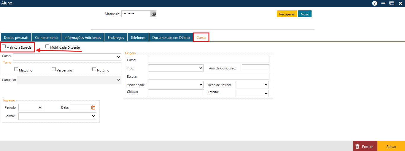 No caso de Alunos Especiais, é necessário acessar a pasta Curso e acionar a caixa de seleção correspondente à Matrícula Especial, como destacado a seguir: