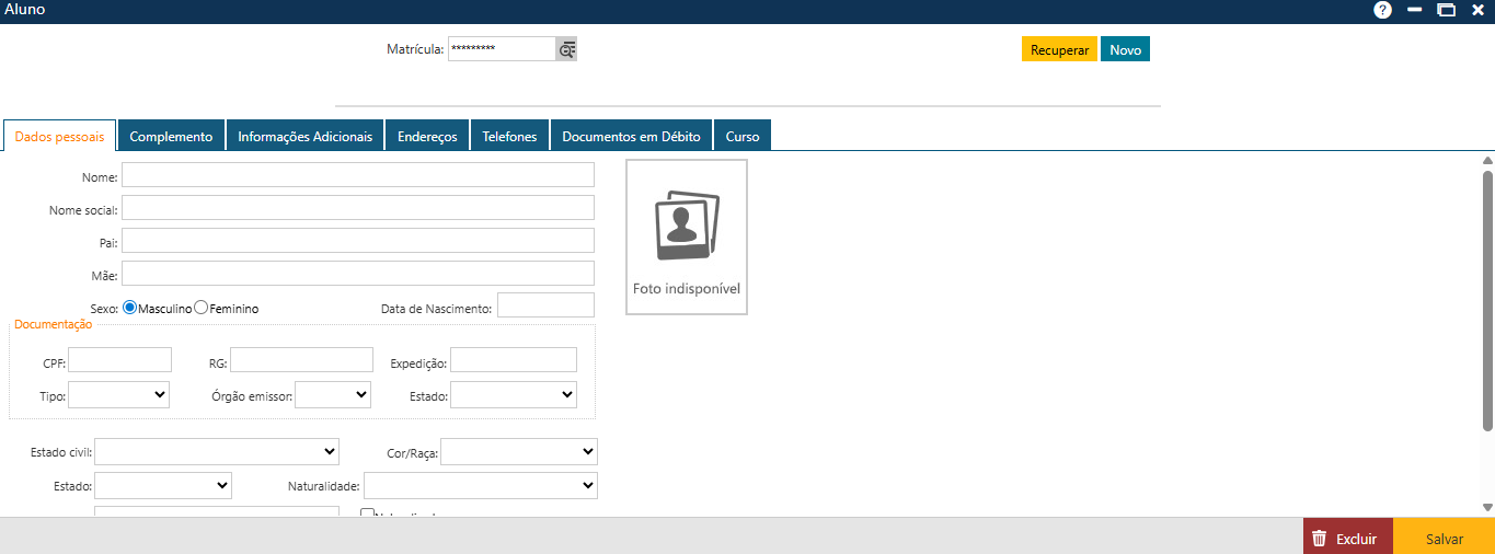 Feito isso, serão exibidas as seguintes pastas para preenchimento dos dados do novo Aluno: