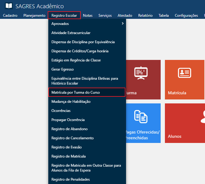 4 – Efetuar a Matrícula por Turma do Curso (Menu Registro Escolar > Matrícula por Turma do Curso), selecionando o Pacote de Atividades Curriculares (Menu Registro > Selecionar Pacotes de Turmas), e salva;