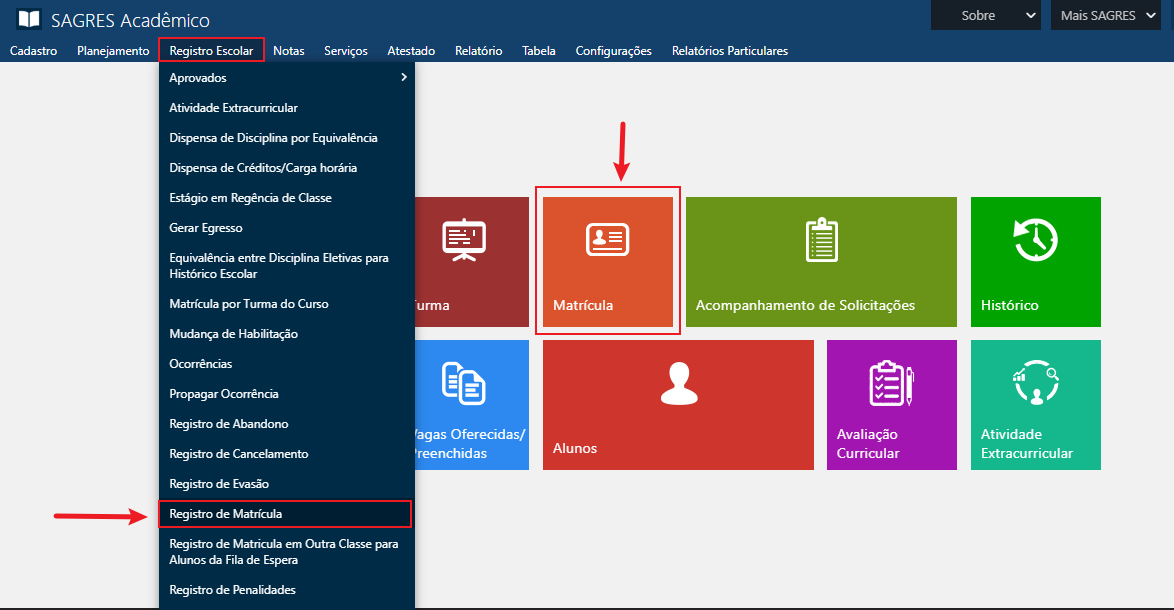 Esta função permite o registro dos Componentes Curriculares (Disciplinas) em que o Aluno se inscreve a cada Período Letivo, na fase da Matrícula (e na fase da Pré-Matrícula, caso seja ofertada essa opção na Instituição). Acessível pelo menu Registro Escolar > Registro de Matrícula ou através do ícone Matrícula.