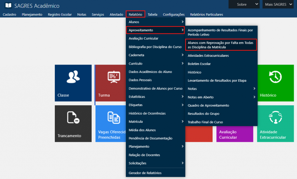 Acessível pelo menu Relatório > Aproveitamento > Alunos com Reprovação Por Falta em Todas Disciplinas da Matrícula, do SAGRES Acadêmico.